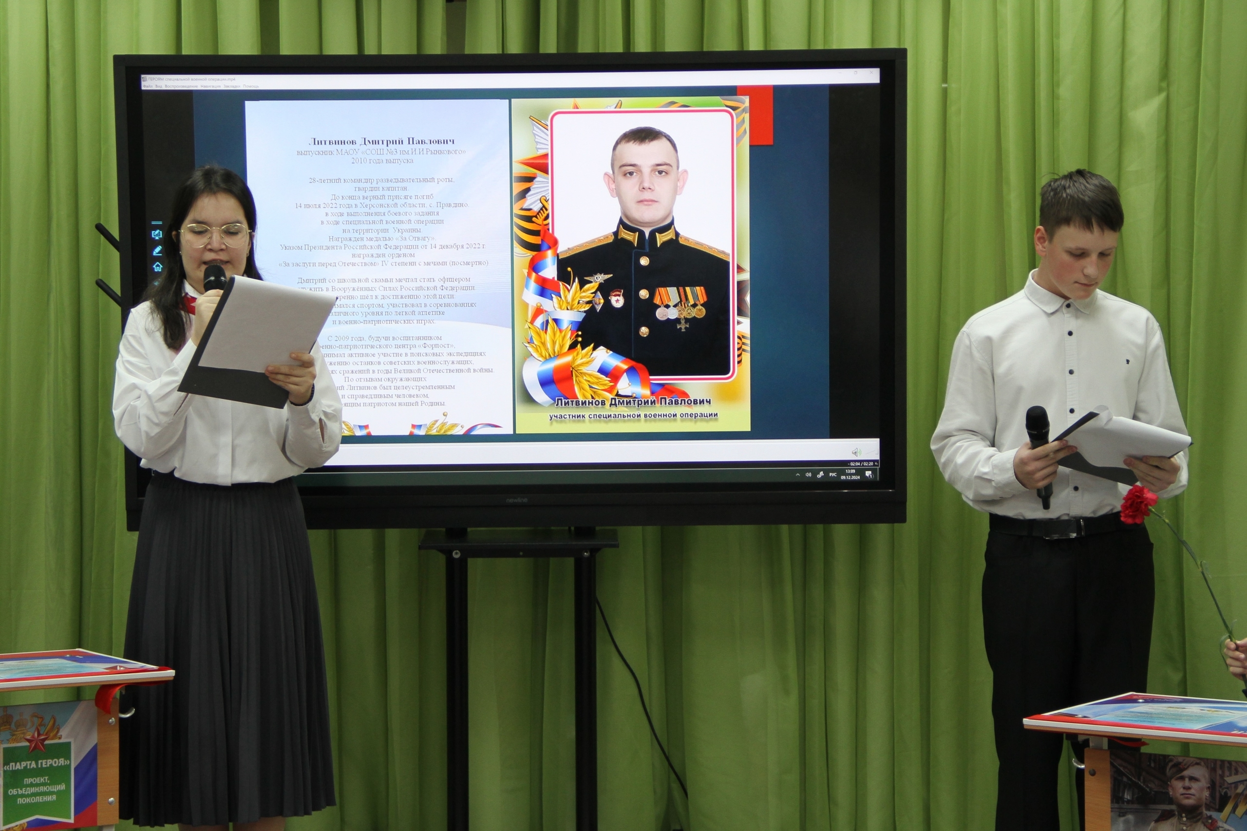 – Кого можно назвать героем, ребята? Герой – это тот, кто готов спасти своего близкого, свою Родину. Тот, кто окажет помощь товарищу и не важно, в каких обстоятельствах – на поле боя или в мирное время. Герой никогда не забывает своих родителей, чтит старшее поколение. Желаю вам, ребята, стать настоящими патриотами своей страны, совершайте достойные поступки, чтобы Родина вами гордилась, – обратилась к детям мама героя Ирина Павловна Литвинова.